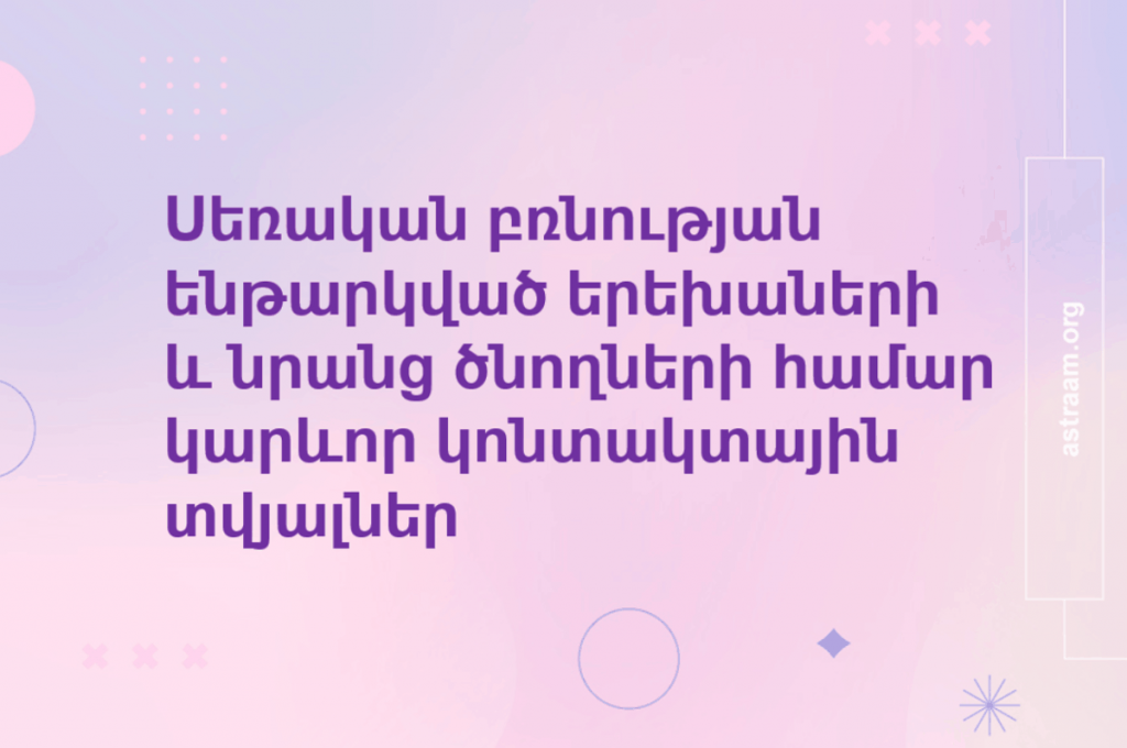 Երեխաների նկատմամբ սեռական բռնությունը, ցավոք, հազվադեպ հանդիպող երևույթ չէ: Մենք՝ ծնողներս, ուզում ենք հավատալ, որ մեր երեխայի հետ նման բան երբեք չի պատահի. այդուհանդերձ, դա կարող է տեղի ունենալ: Յուրաքանչյուր ծնող պետք է իմանա, թե ինչպես սովորեցնել երեխային՝ պաշտպանվել սեռական բռնությունից: Հիշե՛ք.